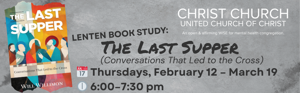 Christ Church UCC invites you to a six-week Lenten journey using The Last Supper: Conversations That Led to the Crossby William H. Willimon. Through scripture, reflection, and conversation, we’ll explore the stories Jesus told at tables and how they prepare us for Holy Week.
